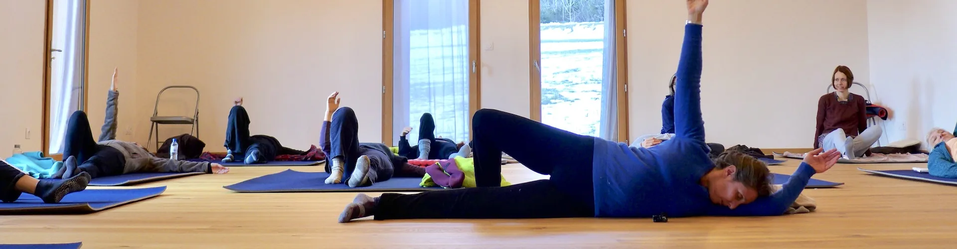 Les séances, différentes chaque jour, sont souvent au sol, allongé-es , assis-es, vous entrez dans un processus que vous effectuez à votre rythme et à votre mesure, sans souci du résultat.